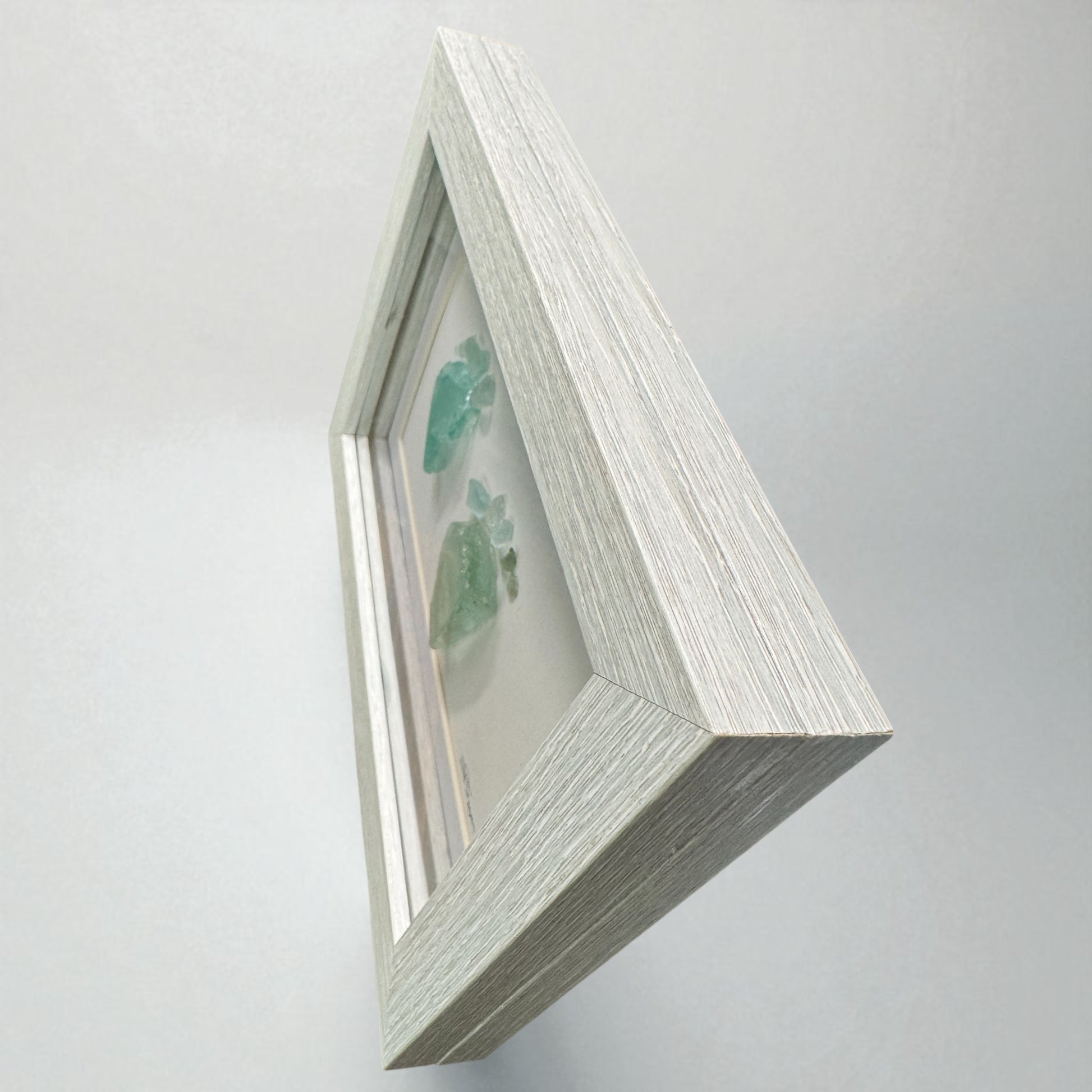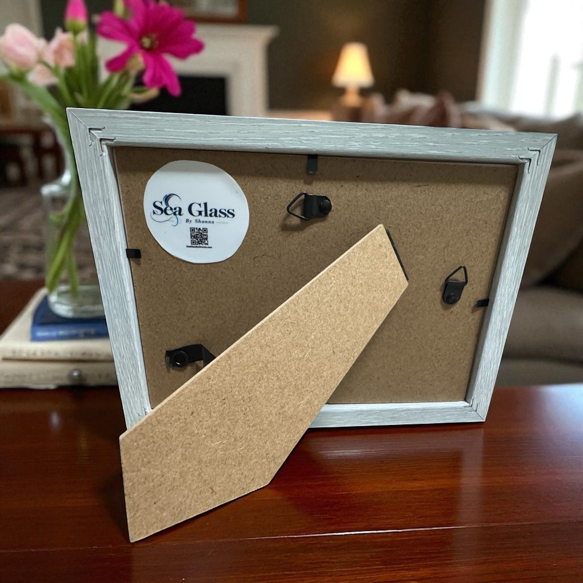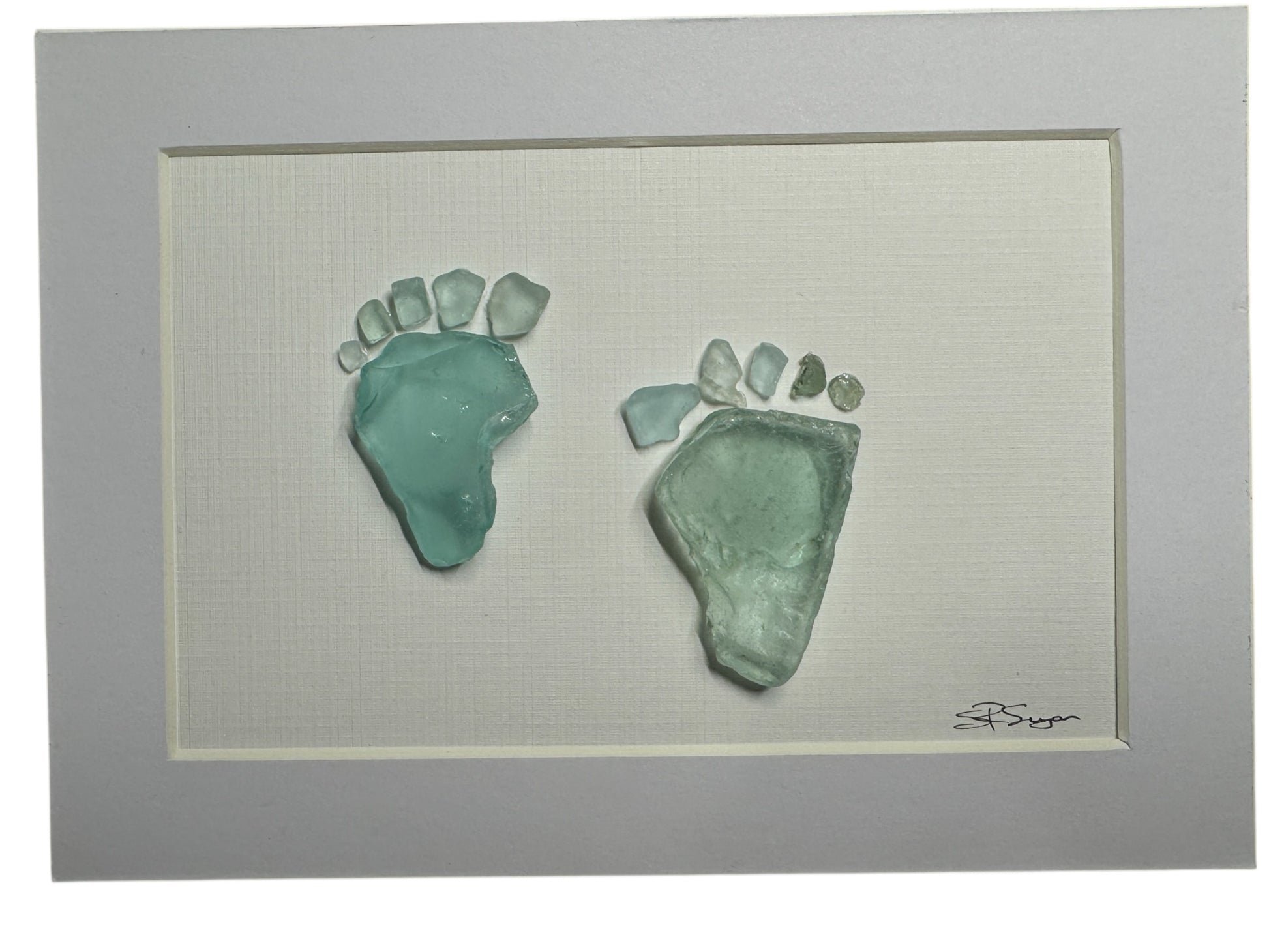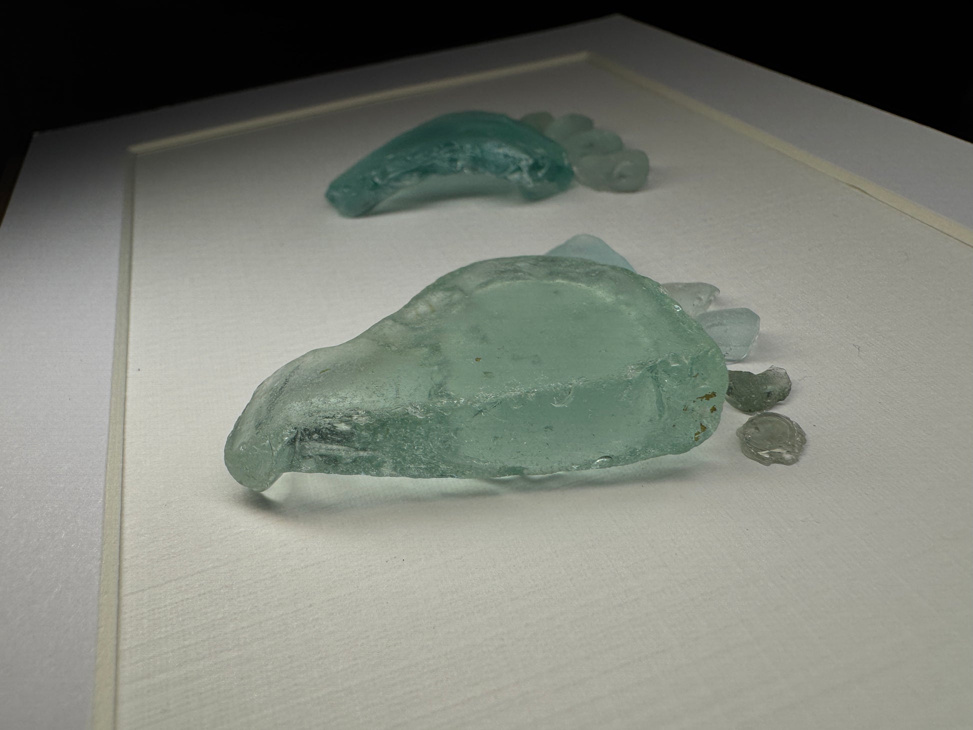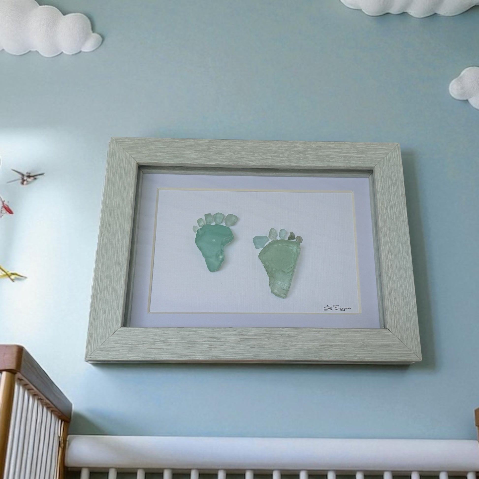 One of a kind sea glass treasure! This stunning 6 x 8 custom created shadow box, features light blue sea glass footprints, meticulously crafted from beautifully thick, vintage sea glass that dates back many decades. Perfect for a nursery or special keepsake! As is, this piece is a gorgeous addition to any baby space. Or, make it extra personal with custom writing: baby's name, birthdate, weight, or any special message you choose! A truly unique gift for new parents or a treasured keepsake for yourself. Own a piece of timeless inspired art!