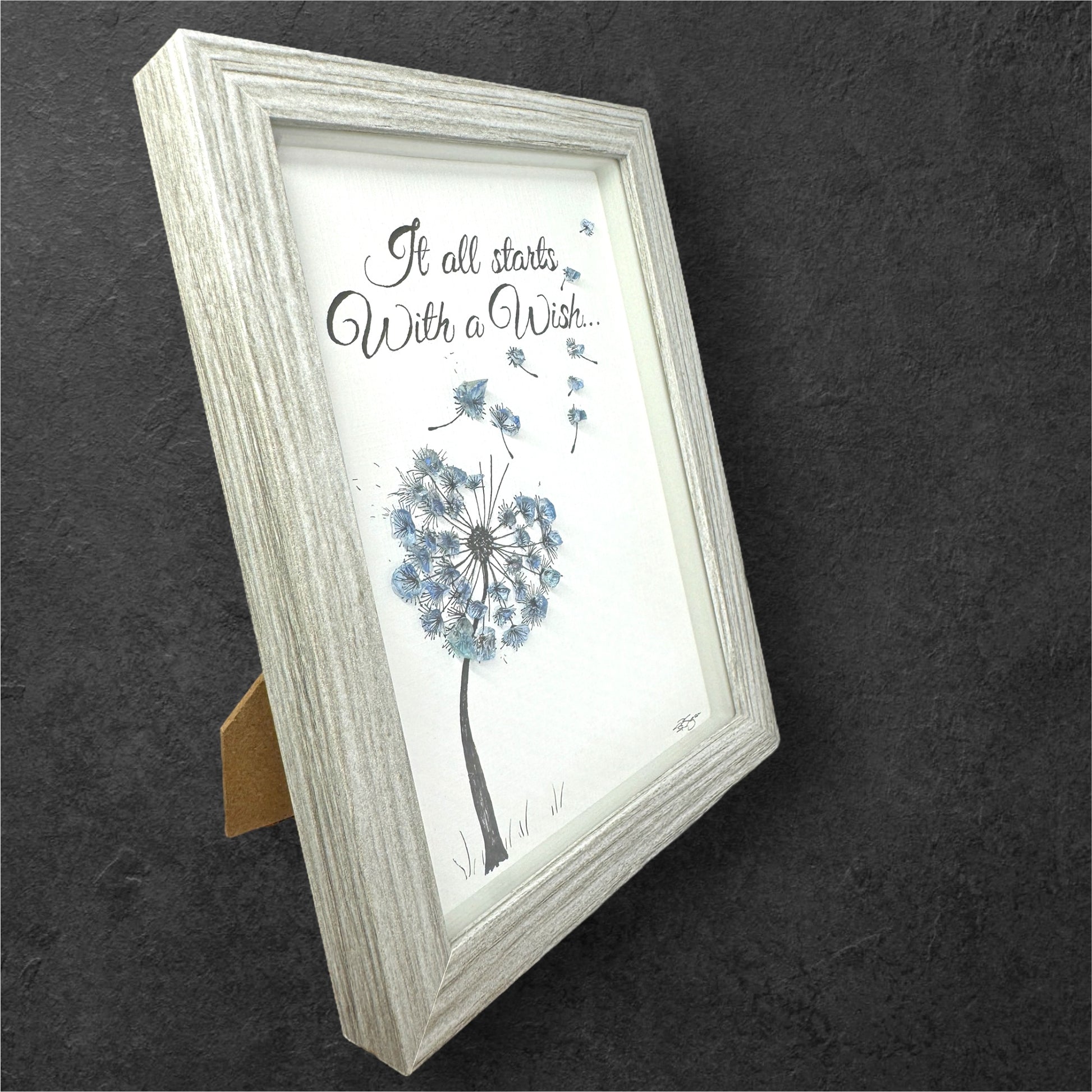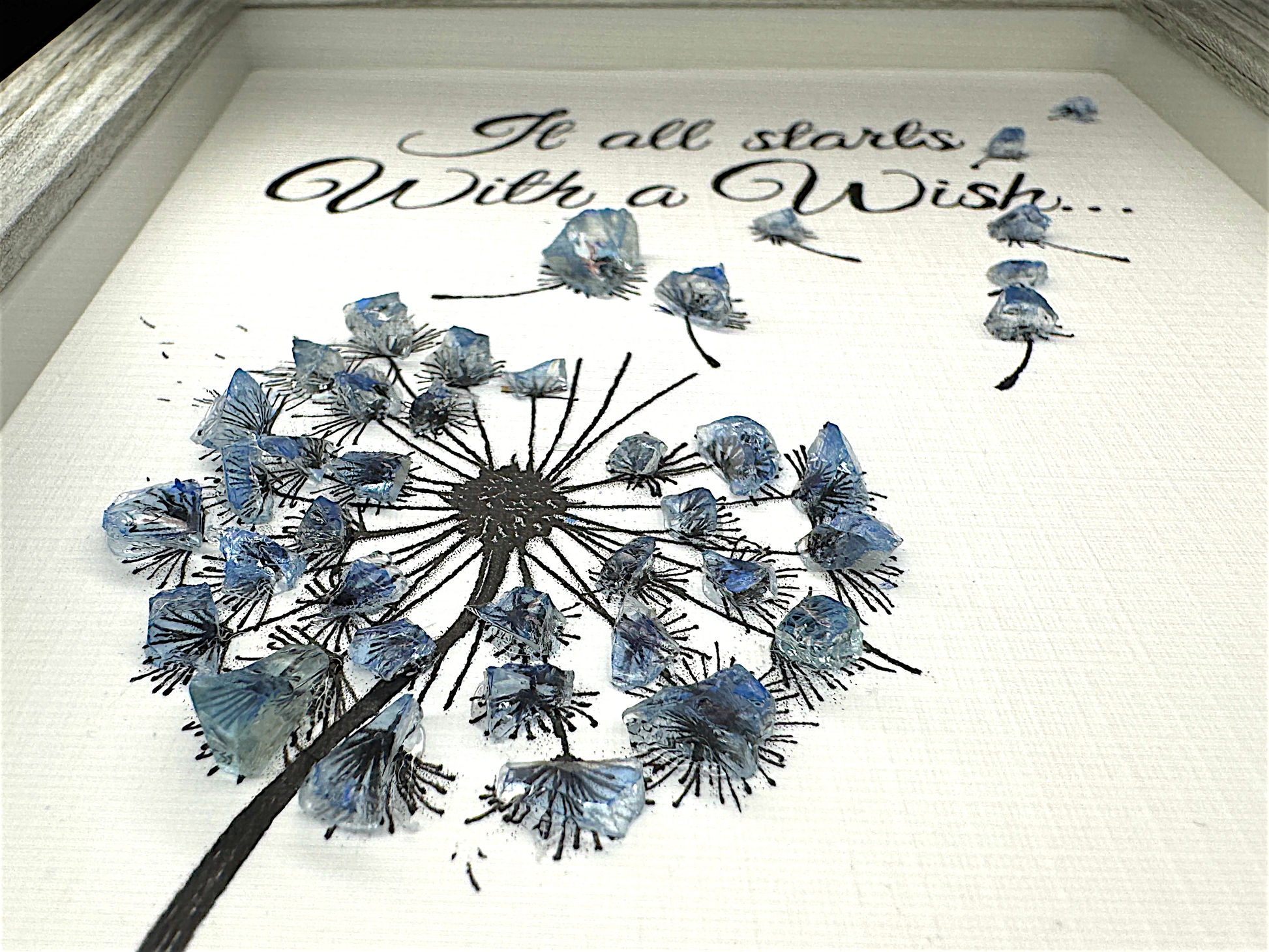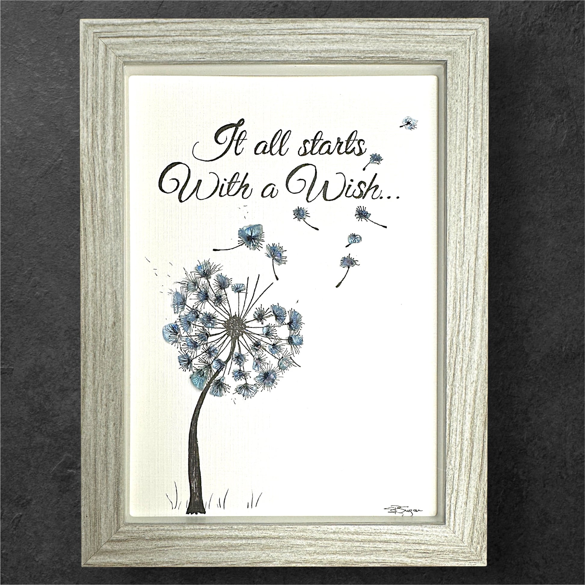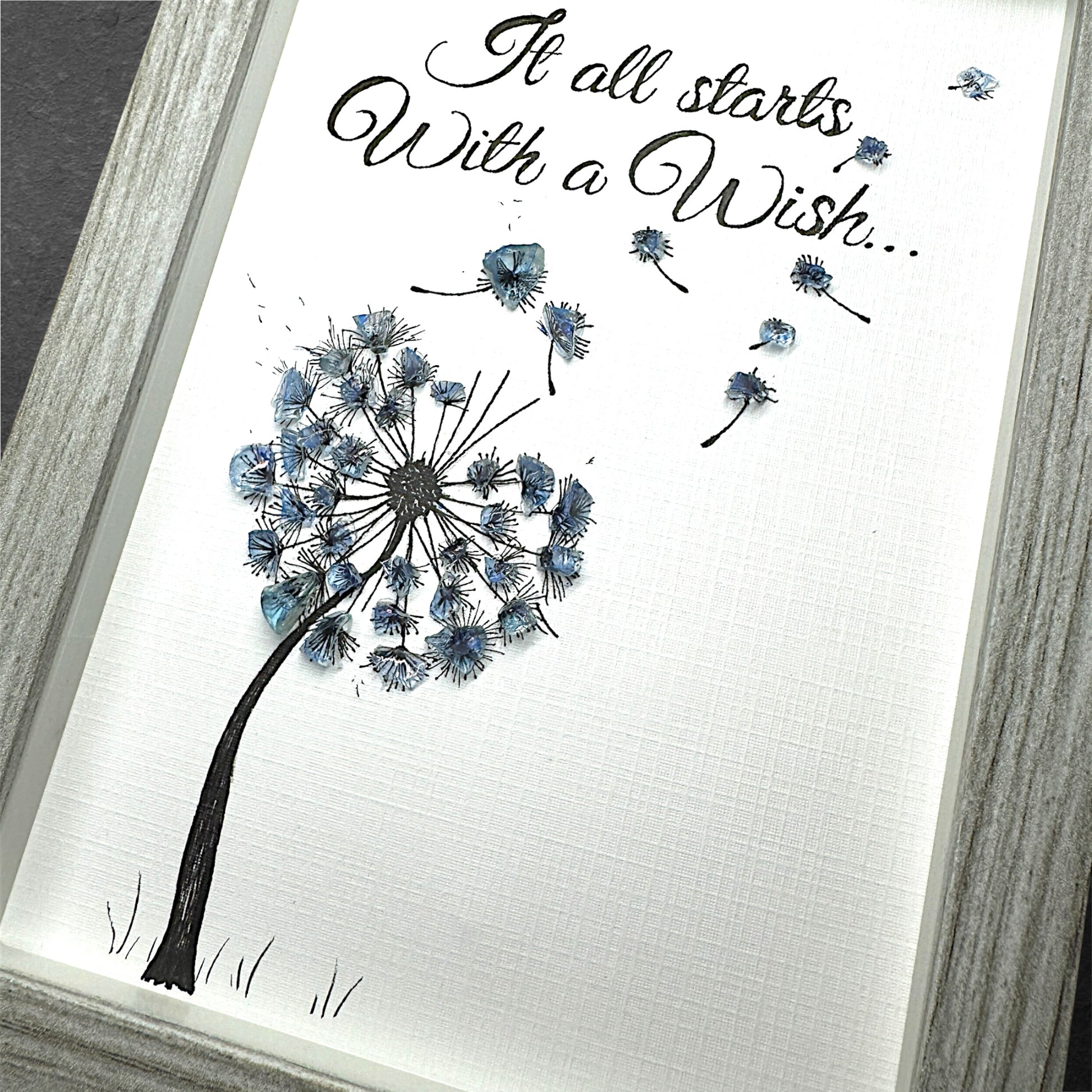 This 6x8 gray shadow box features a light blue, bluer-enhanced sea glass hand drawn dandelion with a few seeds blowing off into the air. The poignant quote "It all starts with a wish" accompanies the delicate sea glass dandelion, creating a whimsical and hopeful piece of art.