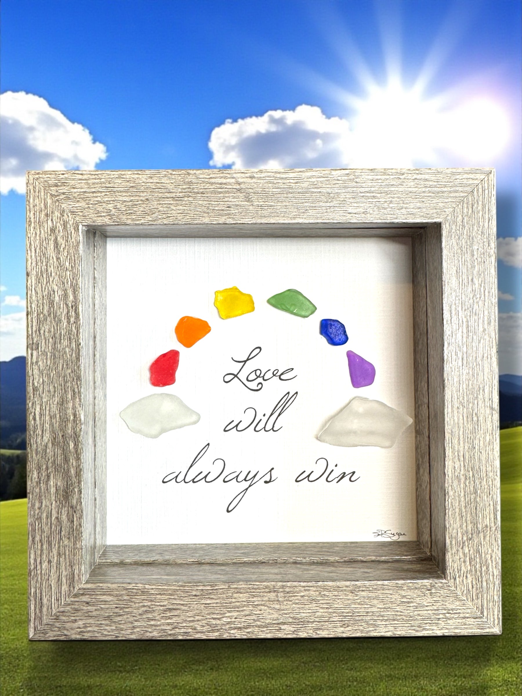 Bring a burst of color and joy into your home with this vibrant 5x5 inch sea glass art piece featuring a stunning rainbow with fluffy clouds on each end. Crafted from genuine sea glass in green and blue sea glass and color enhanced shades of red, orange, yellow, purple. This rainbow is a beautiful representation of hope and promise.