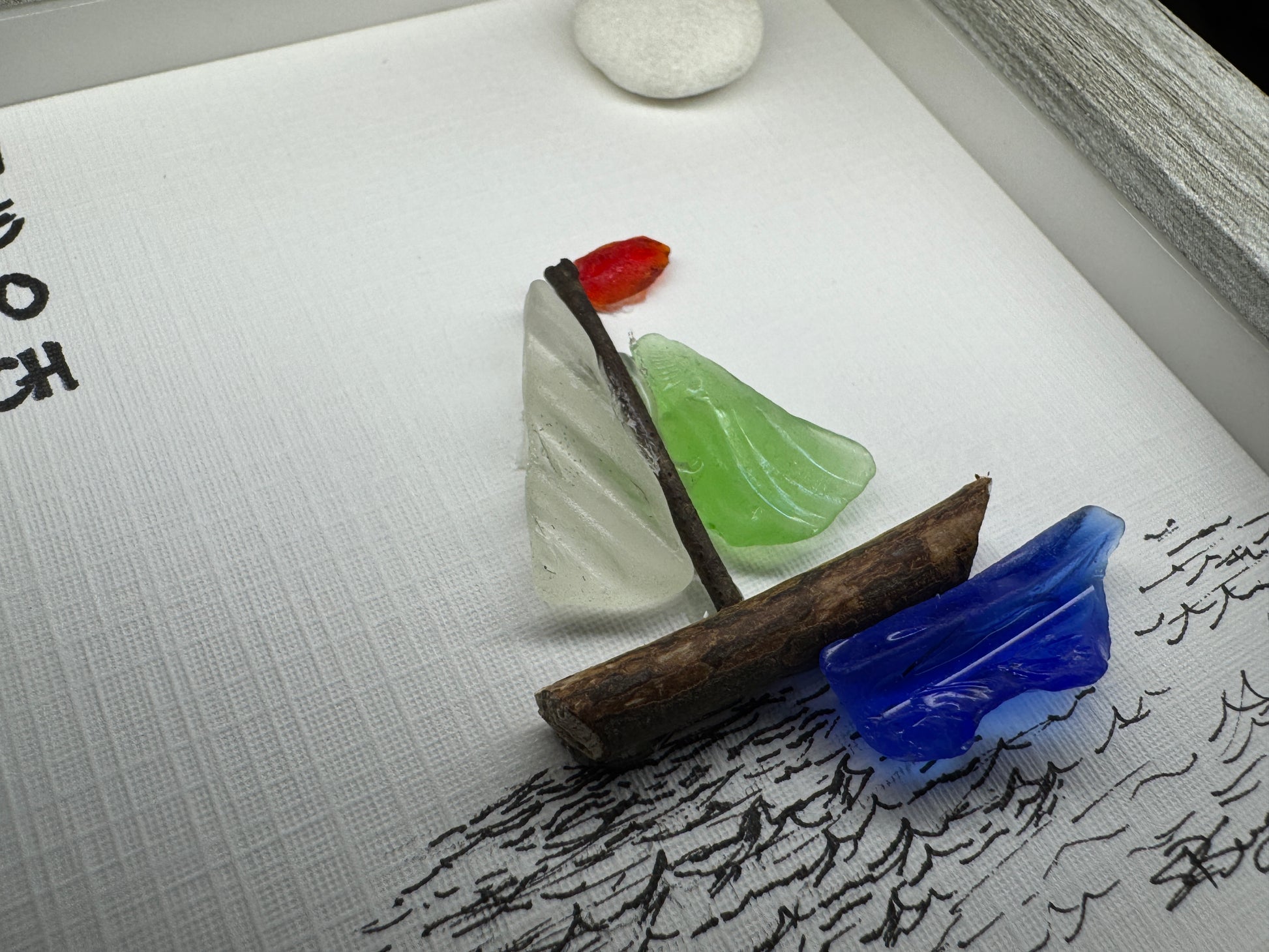 In the vast expanse of the ocean, a lone sailboat glides across the waves. This piece is crafted with an extremely rare red and very rare cobalt blue sea glass. Housed in a 4x6 shadow box, this piece embodies freedom and adventure. The quote 'Life takes you down many paths, but the best ones lead to the beach' captures the essence of serenity and joy found by the sea, making this a treasured keepsake for beach lovers and dreamers alike.