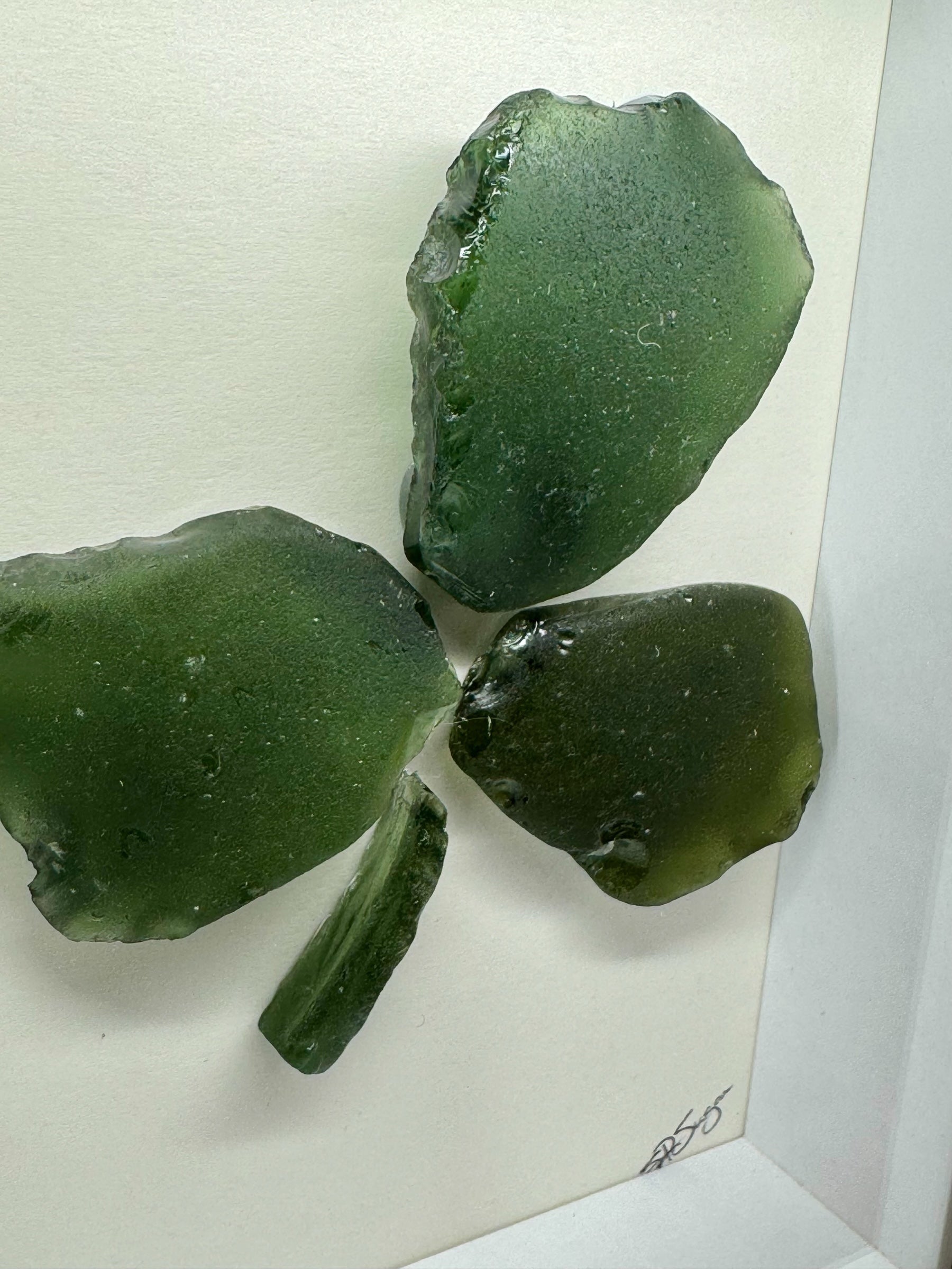 Three Large Pieces of ANTIQUE OLIVE GREEN Beach Sea Glass displayed in a front glass 5x7 shadow box! Hang on wall or stand on table.
