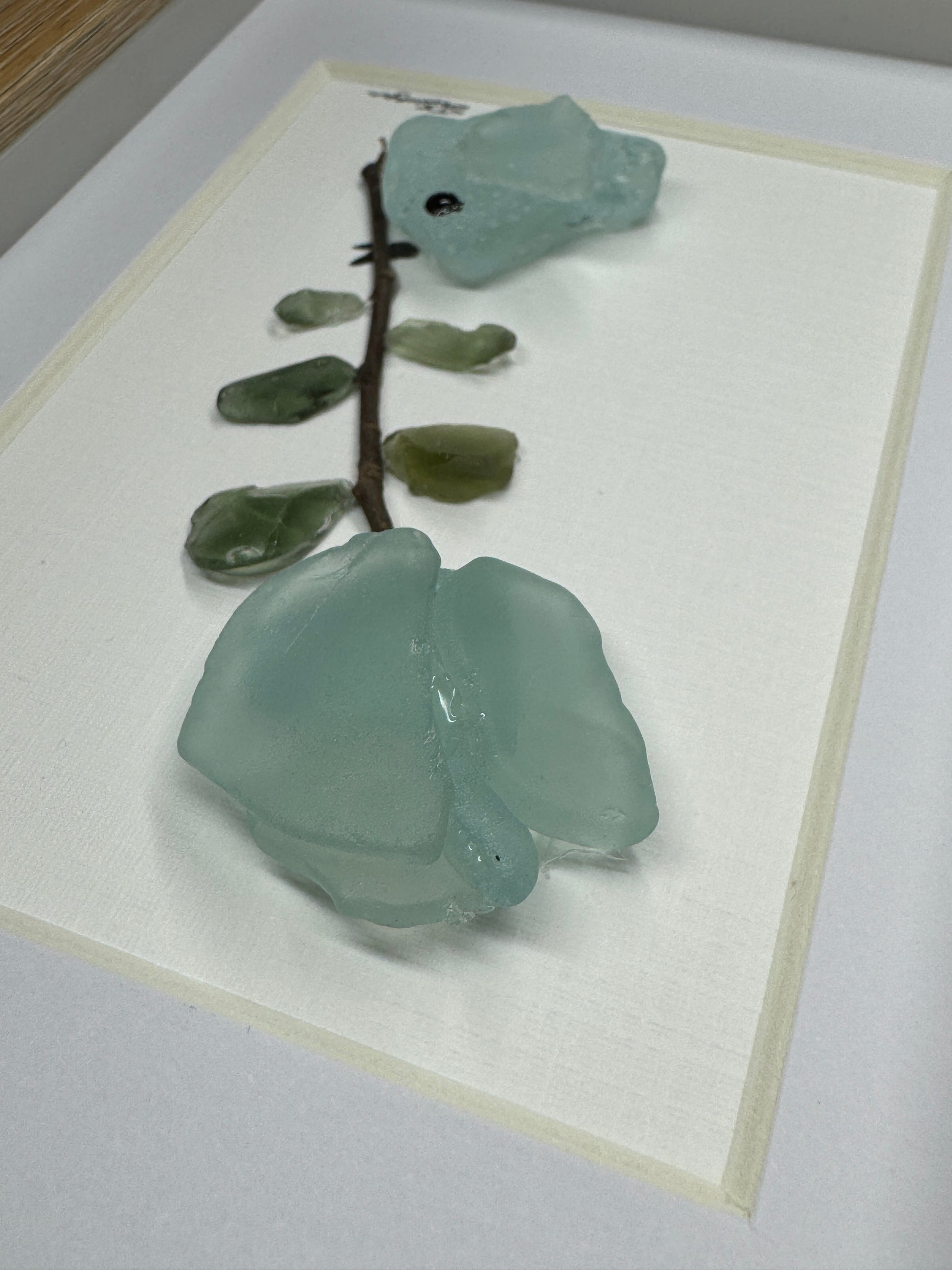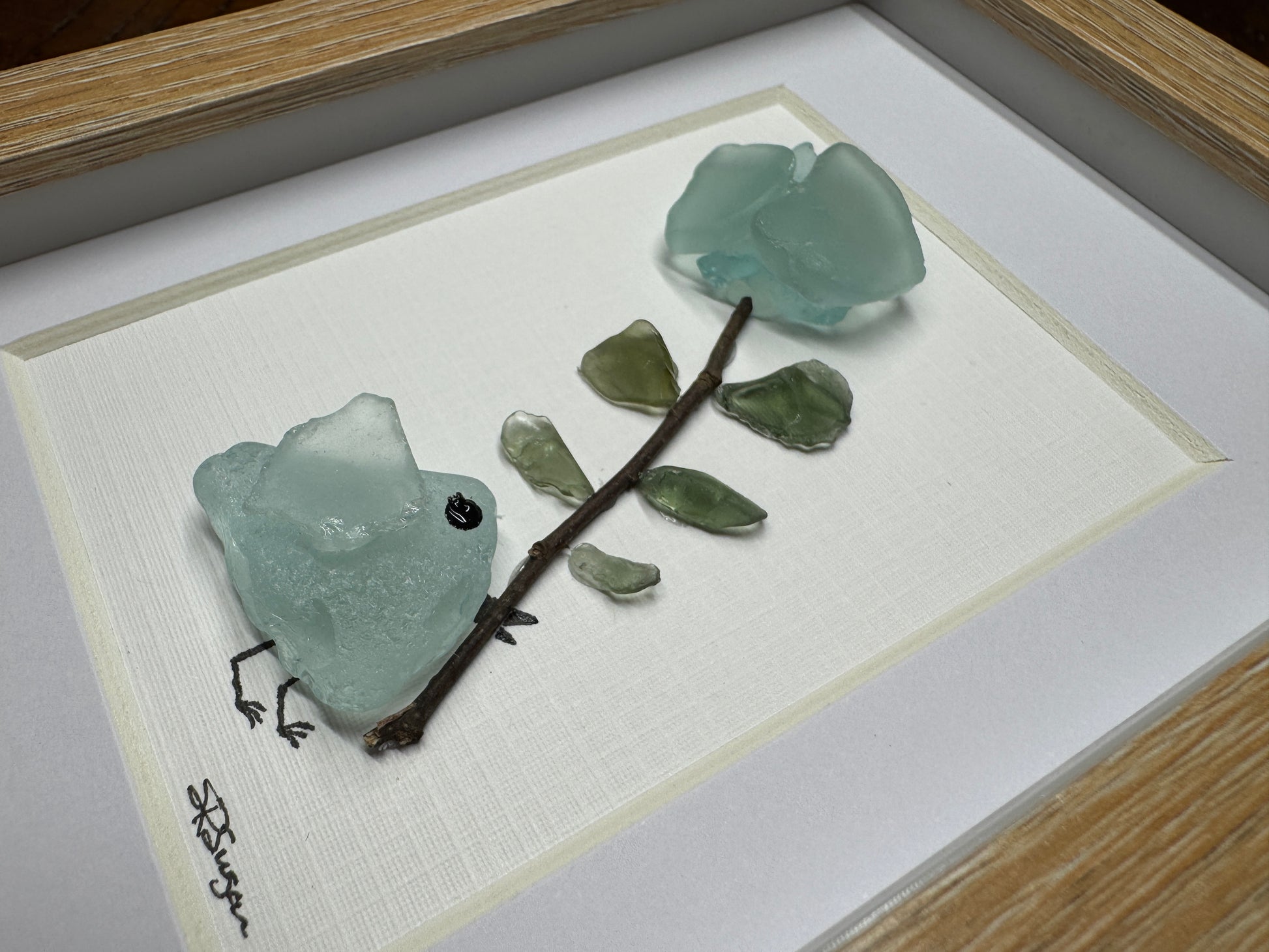 Delicate sea glass in soothing blue hues forms a lovely bird cradling a tender blue flower rose, symbolizing hope, serenity, and joy. A peaceful 4 x 6 shadowbox piece to brighten any space!