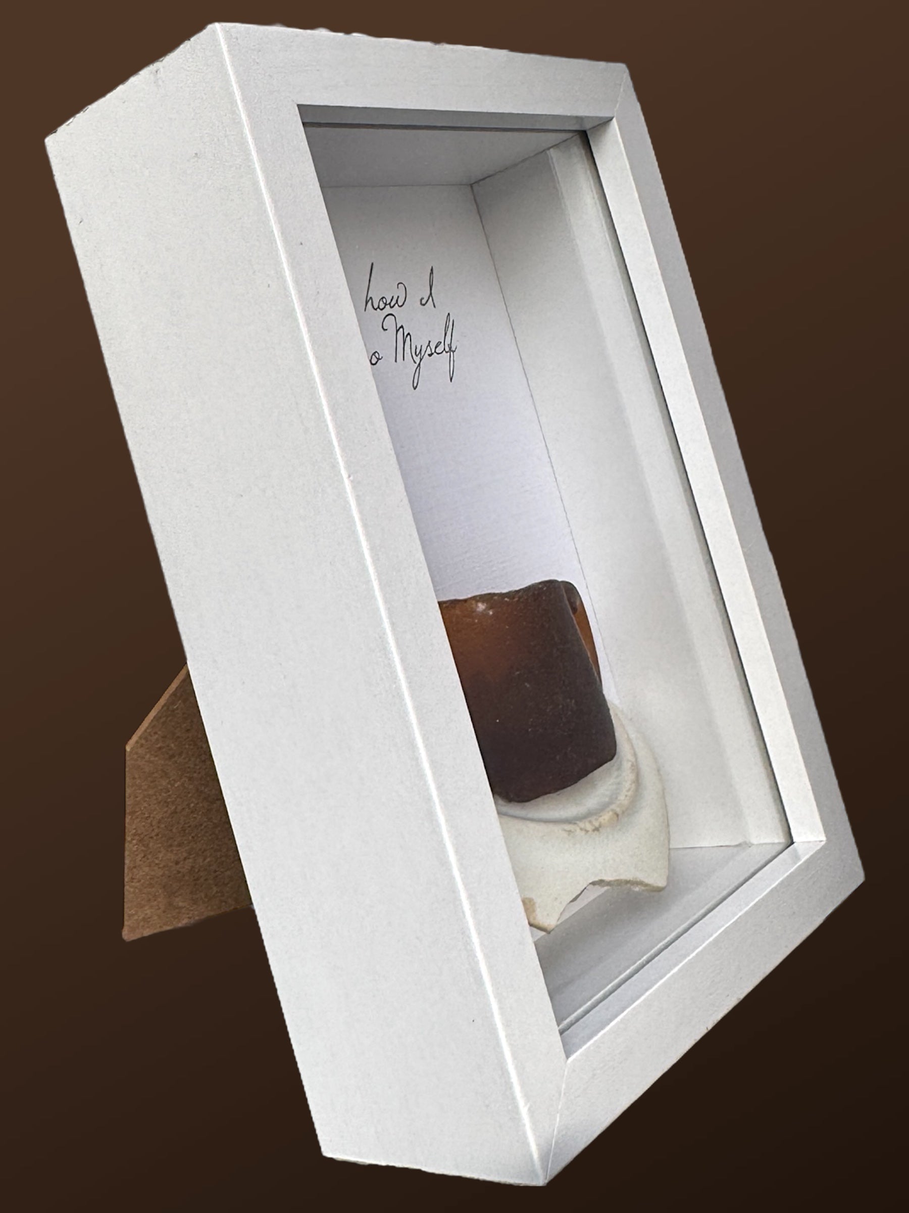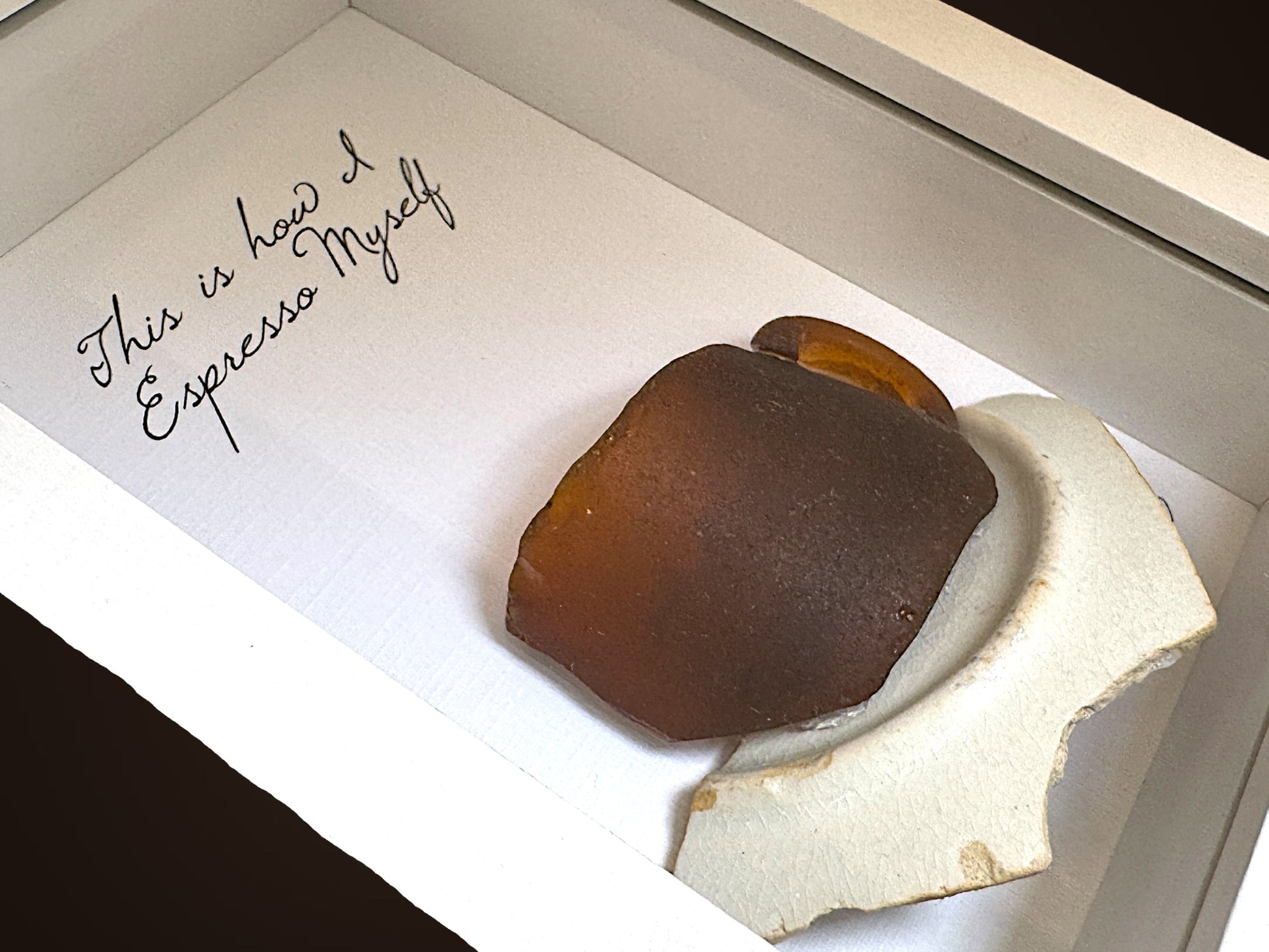 A unique, handcrafted art piece featuring an espresso cup and saucer created from genuine, decades-old sea glass and pottery, meticulously arranged in a 3D design within a 6x8 shadow box frame. The frosted sea glass, worn smooth by the relentless ocean waves over the years, adds a touch of nostalgia and character to the piece.