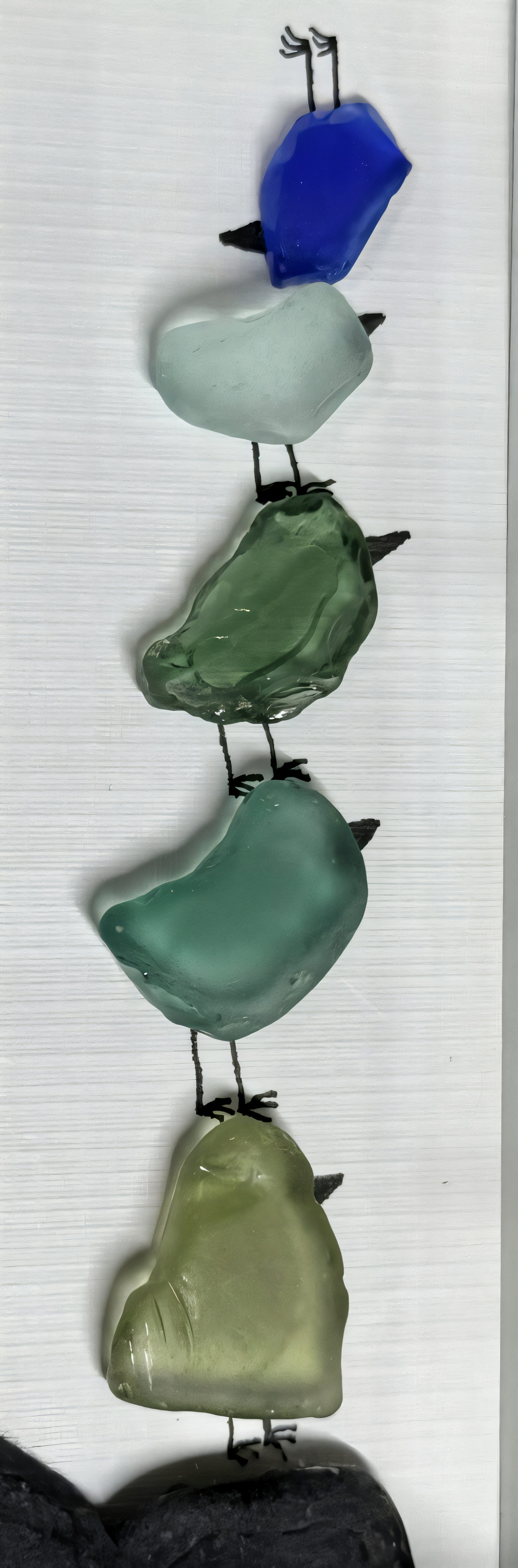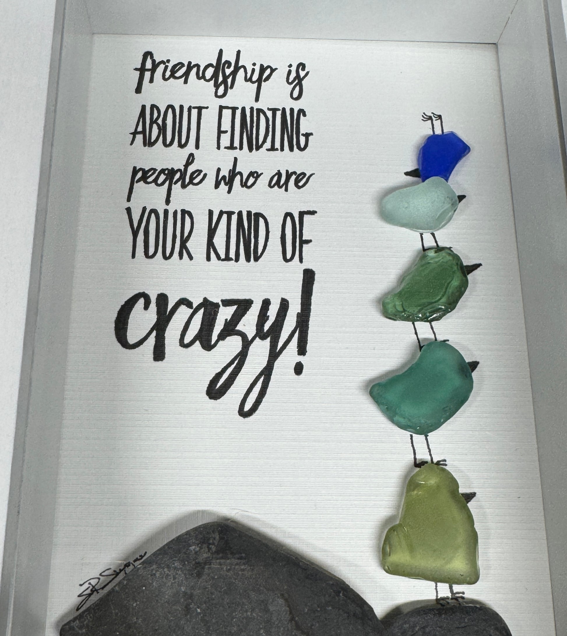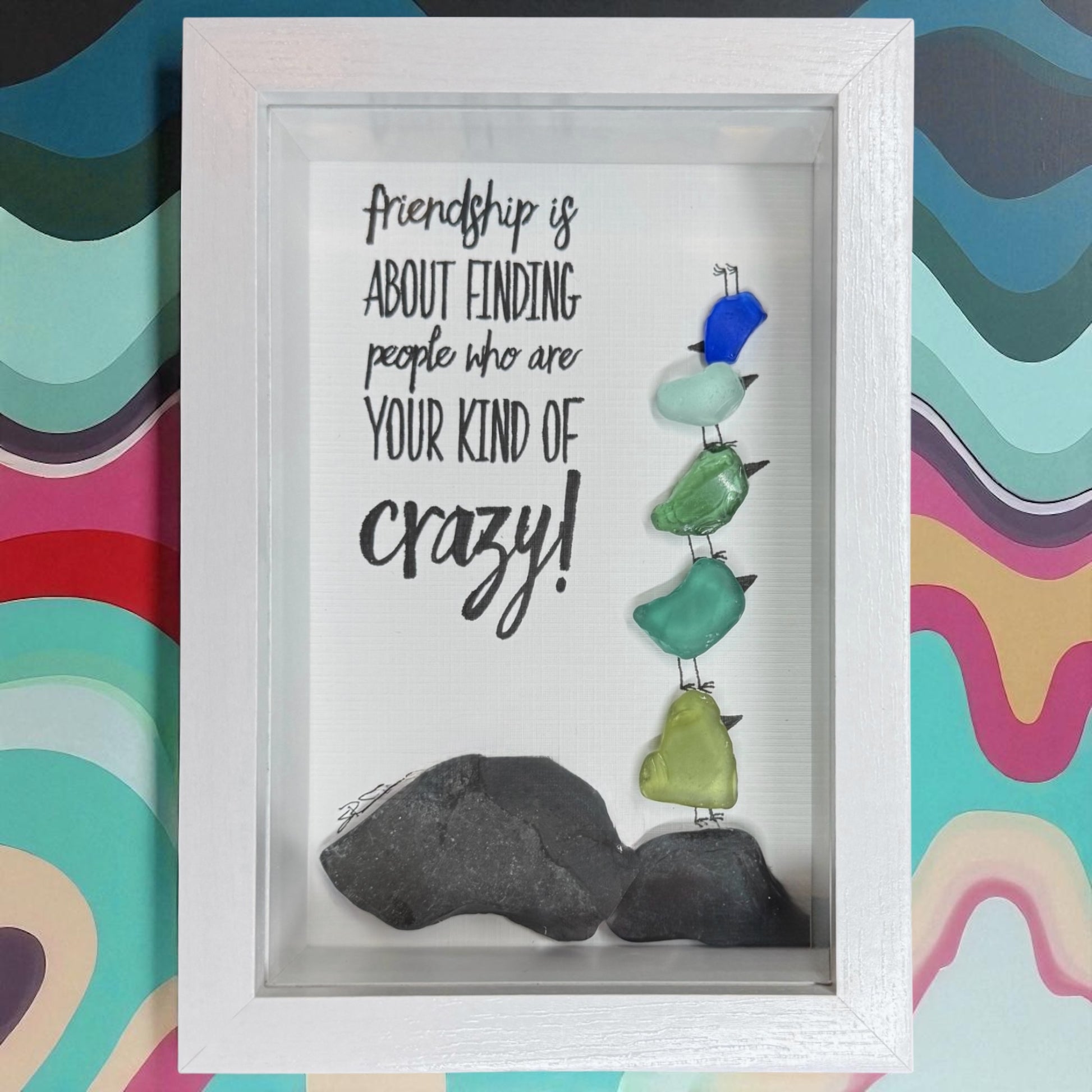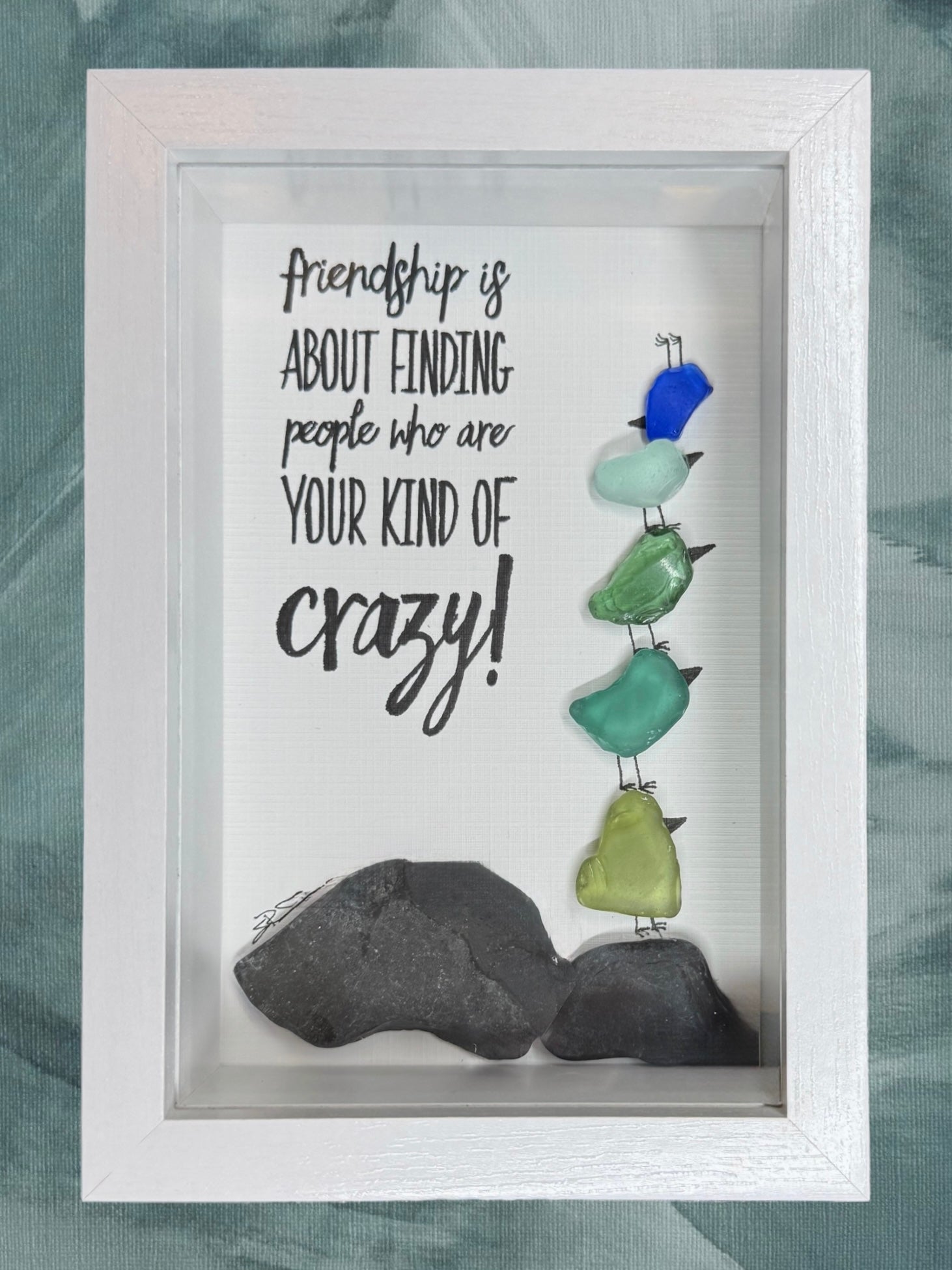 A whimsical flock of birds, crafted from rare and uncommon sea glass colors, perch, a top each other in a playful stack. The top bird, delightfully upside down, adds a touch of quirky charm all crafted in a 4.7x6.7 shadow box with HD glass. Accompanied by the quote 'friendship is about finding people who are your kind of crazy!', this unique piece celebrates the joy of embracing individuality and the beauty of special bonds.