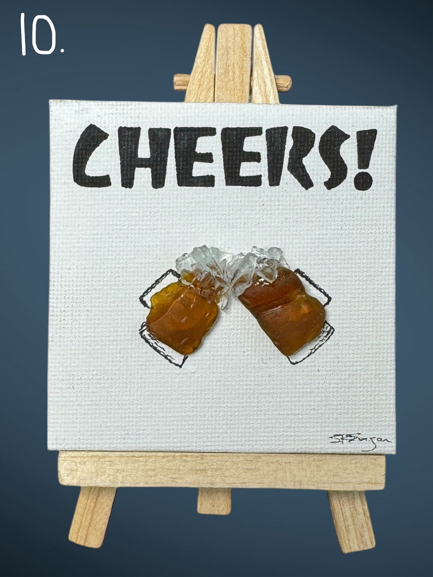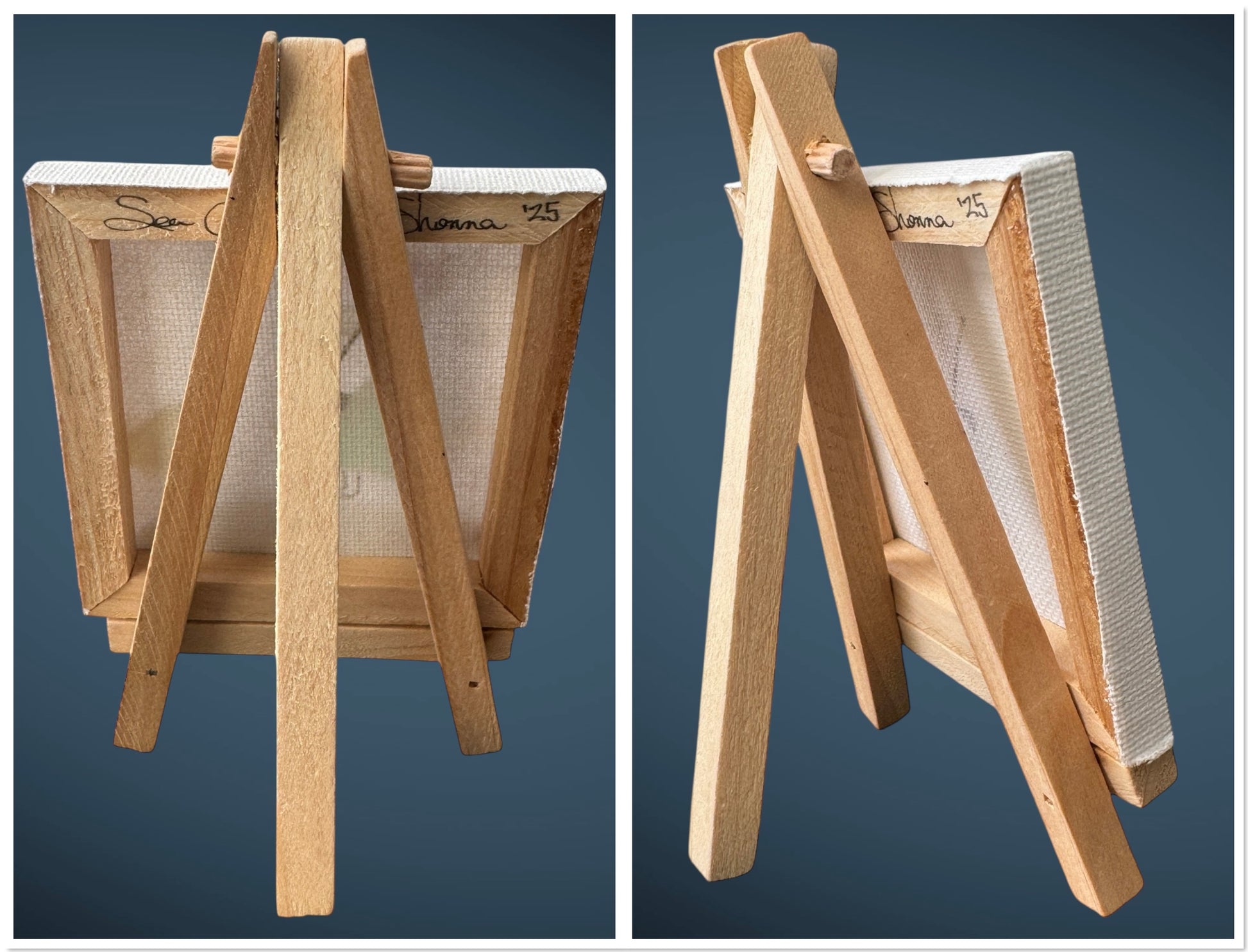 - Each piece is carefully crafted on a 3x3 mini canvas AND INCLUDES a foldable wooden easel (2.75”x4.75”)