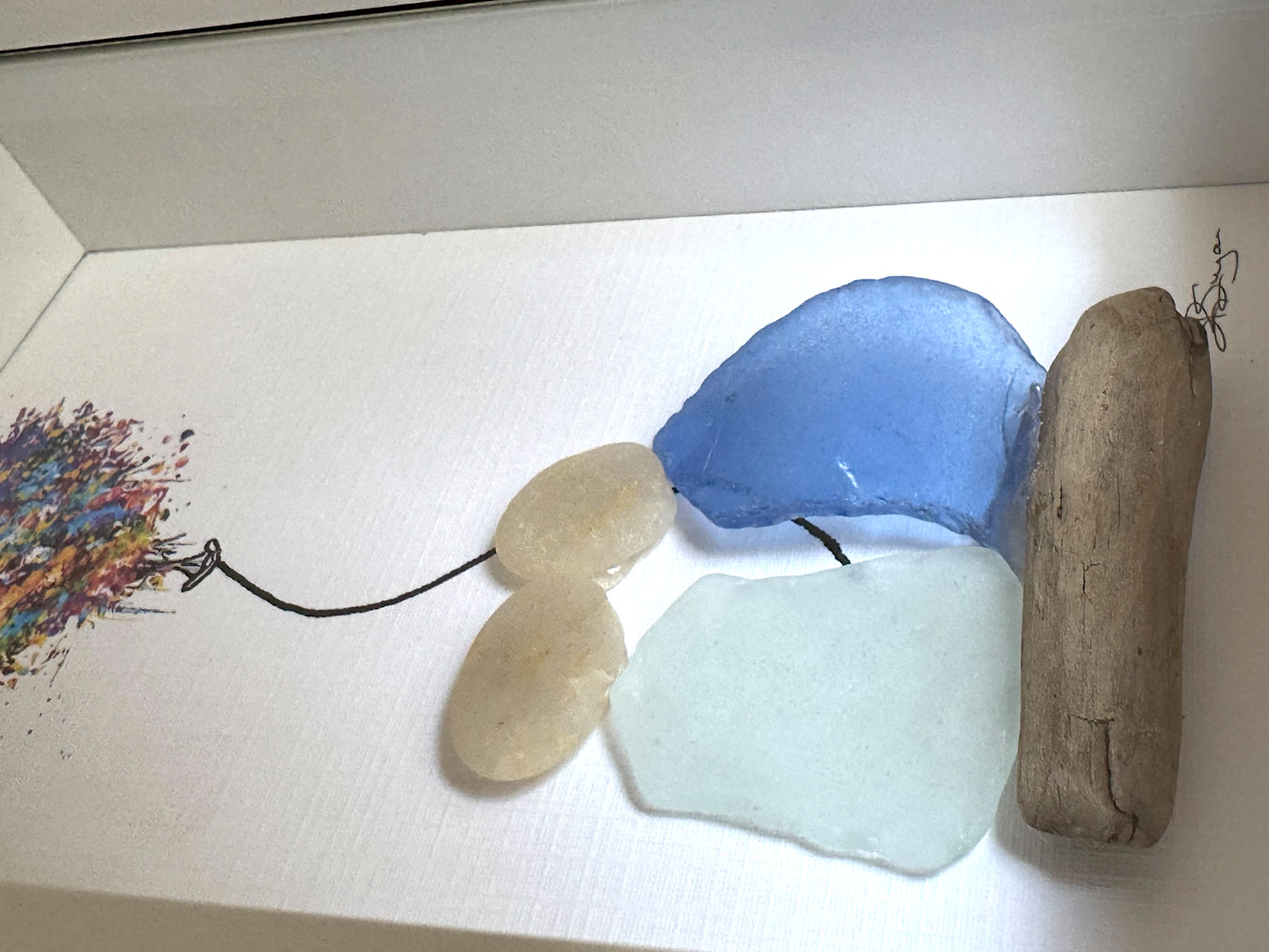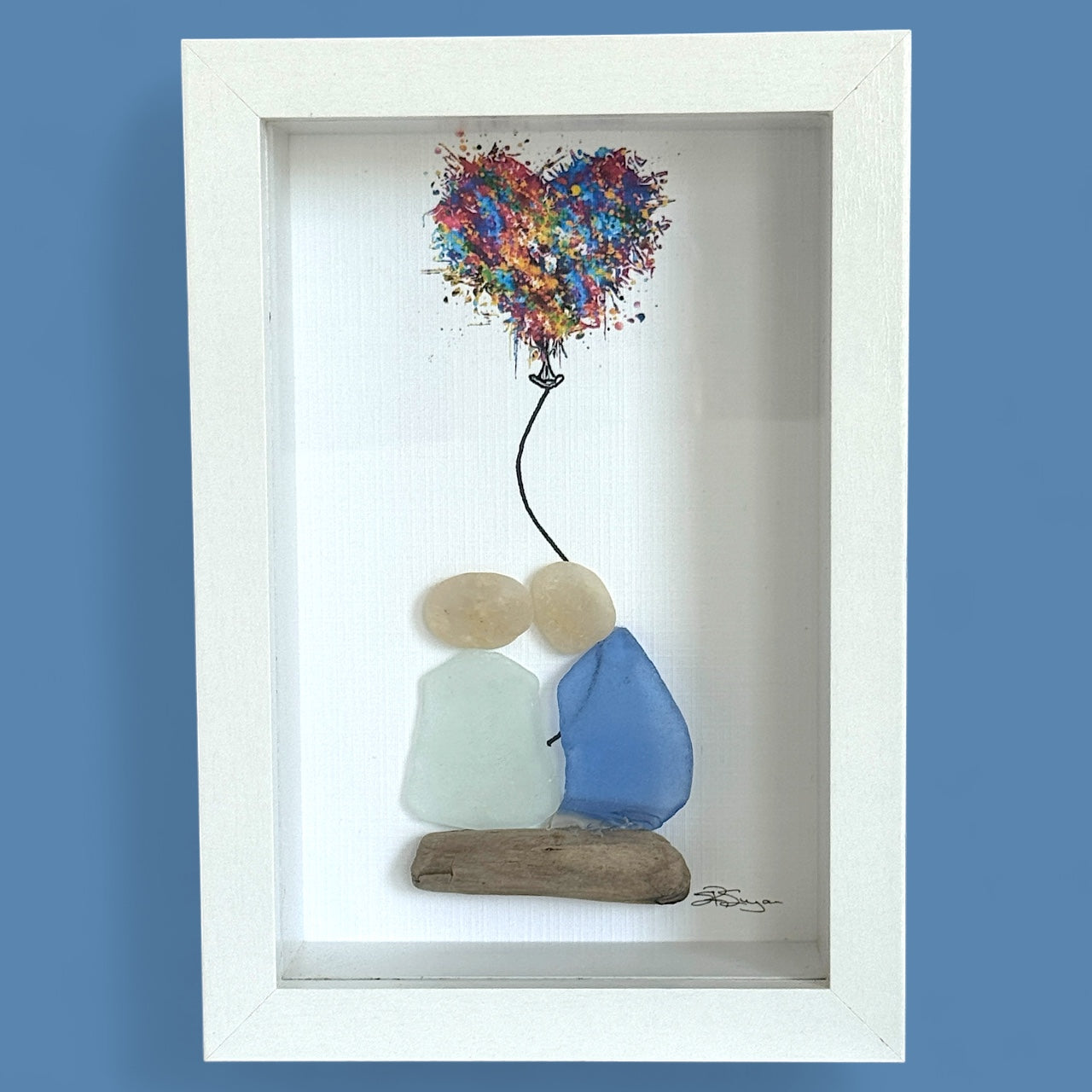 This captivating art piece, showcased in a 6x8 shadowbox, beautifully captures the essence of love and connection. Natural stone heads are paired with uncommon ice aqua and soft blue sea glass bodies, symbolizing the union of two individuals. The figures are depicted sitting together on a piece of driftwood, holding a vibrant heart-shaped balloon that represents the joy and beauty of their relationship. This piece is a heartwarming tribute to the love and bond shared between two people.