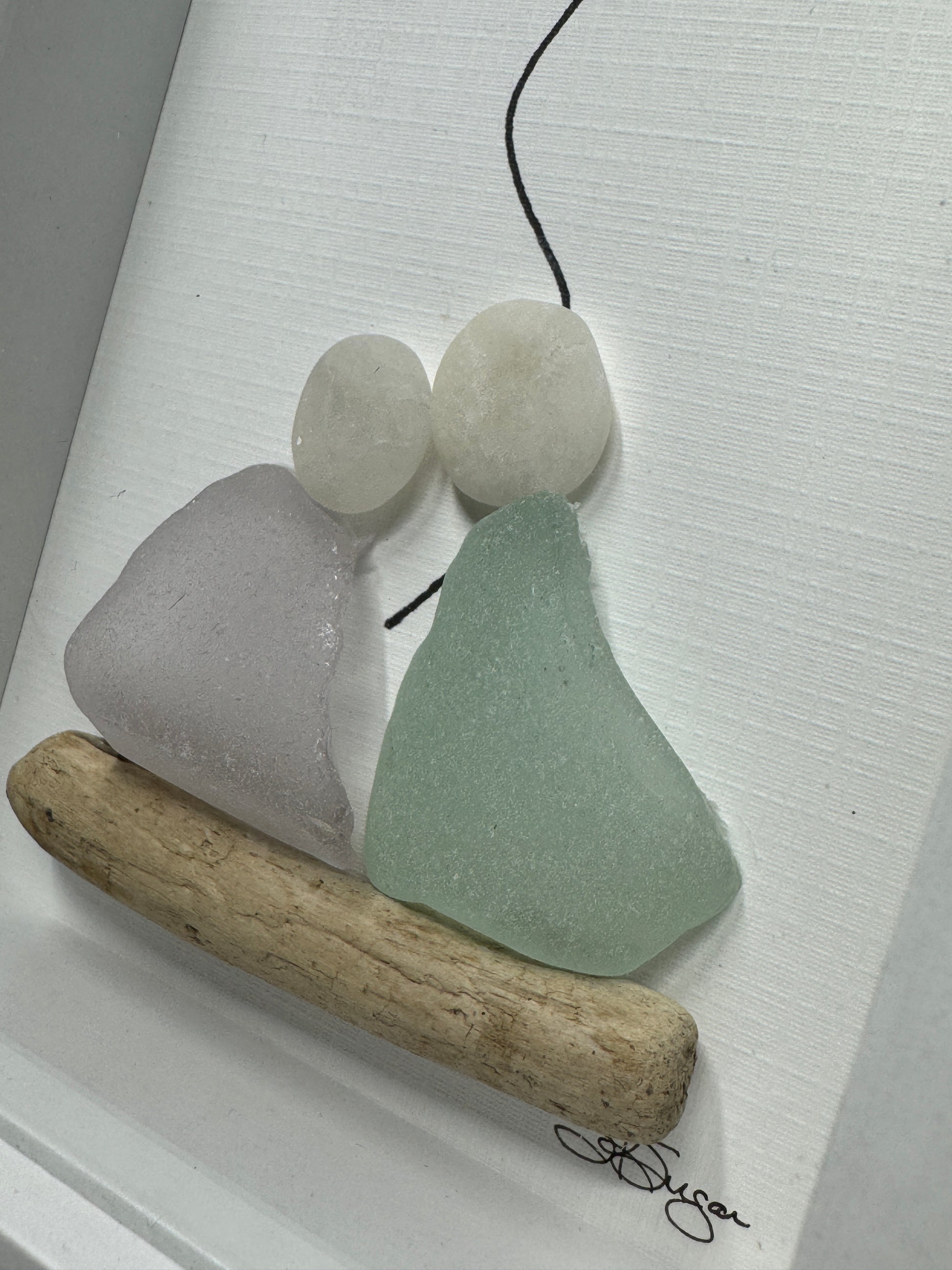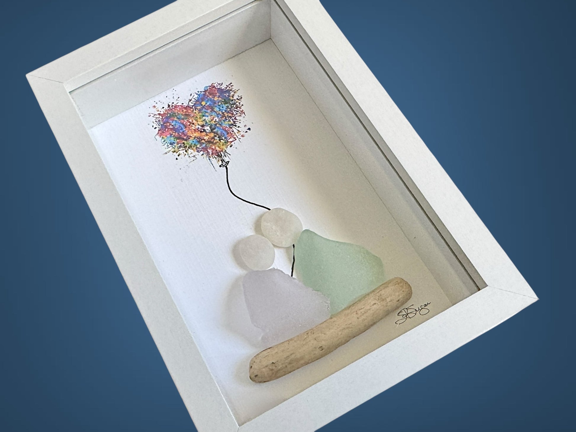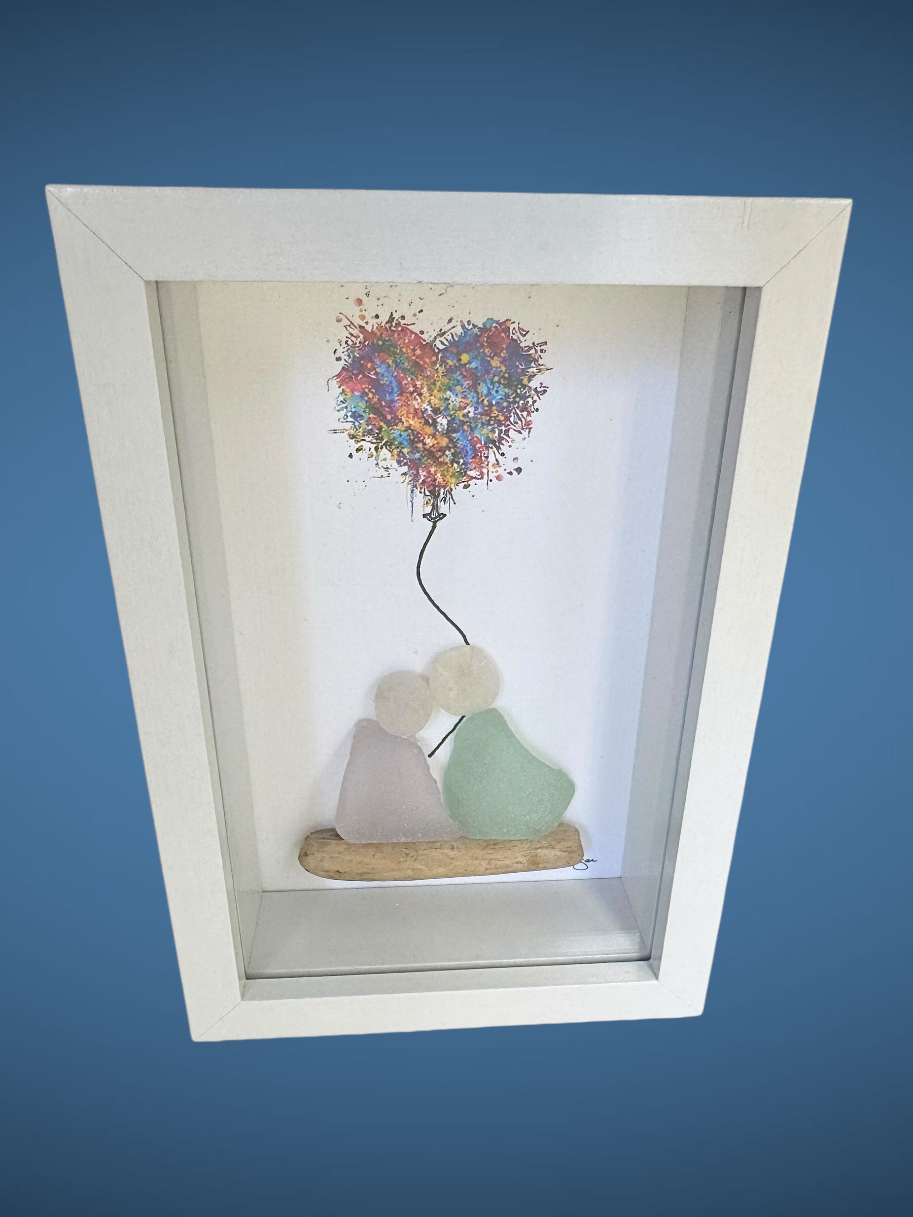This captivating art piece, showcased in a 6x8 shadowbox, beautifully captures the essence of love and connection. Natural stone heads are paired a rare sun purple and an uncommon seafoam colored sea glass bodies, symbolizing the union of two individuals. The figures are depicted sitting together on a piece of driftwood, holding a vibrant heart-shaped balloon that represents the joy and beauty of their relationship. This piece is a heartwarming tribute to the love and bond shared between two people.