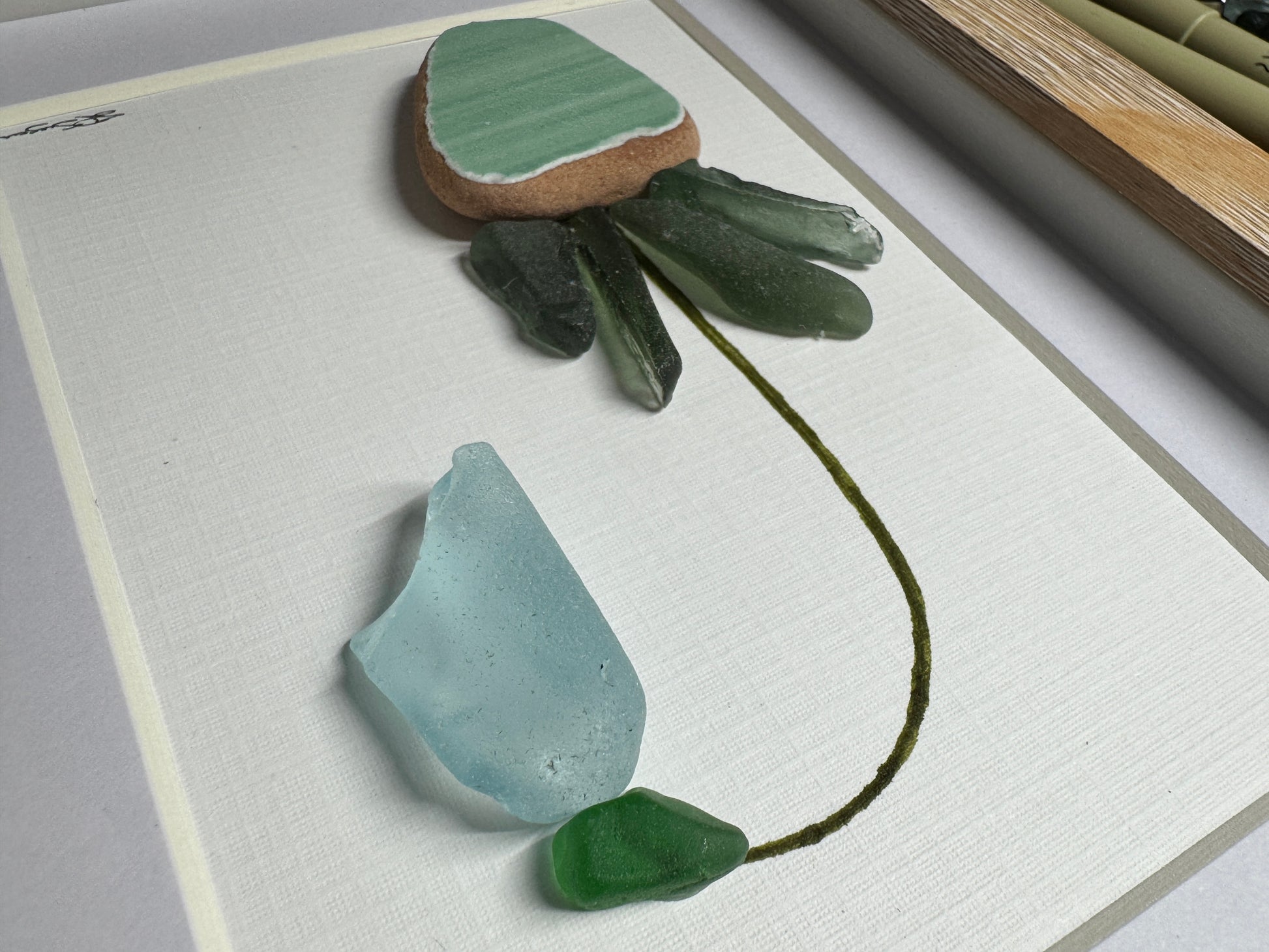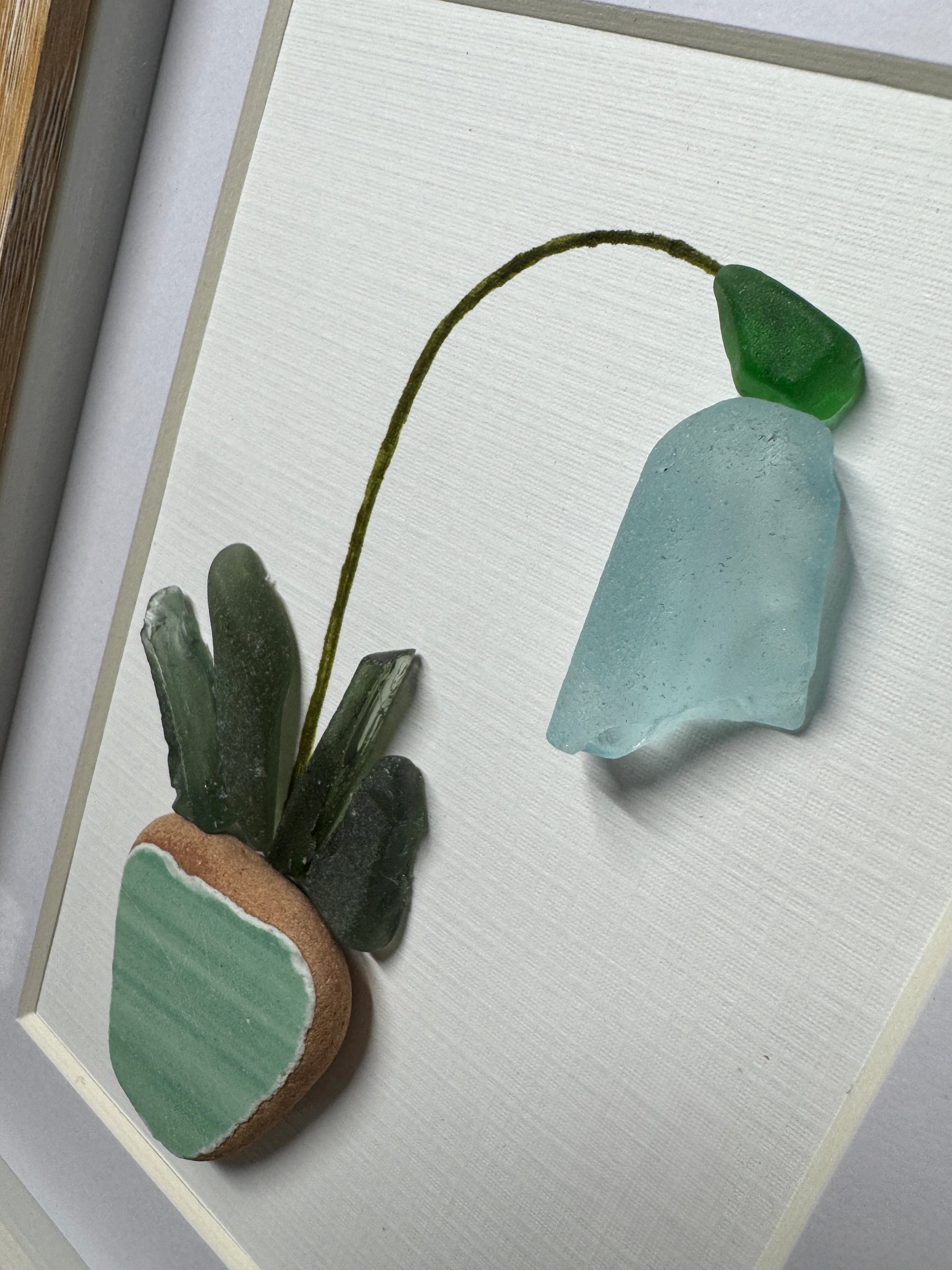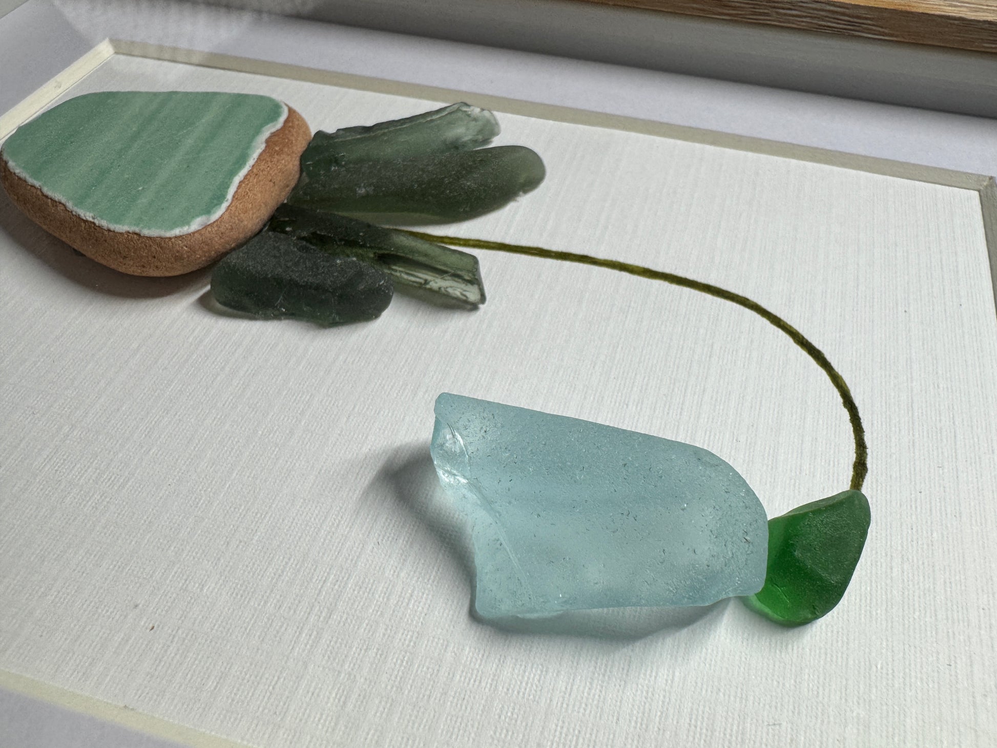 This 6x8 shadowbox features a stunning piece of genuine sea glass art, meticulously crafted to resemble a delicate flower in a pot. The pot itself is a beautiful tile discovered on the picturesque Amalfi Coast in Italy, adding an authentic touch to this unique artwork.