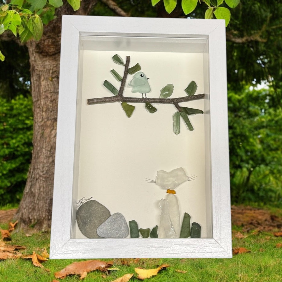 Crafted from sea glass, this 5 x 7 shadow box showcases, a sweet cat in grassy surroundings, eyes fixed on a bird in a tree, ideal for cat lovers and nature fans! Beautifully framed and ready to hang. Grab this exclusive piece for a special gift or to treasure yourself!
